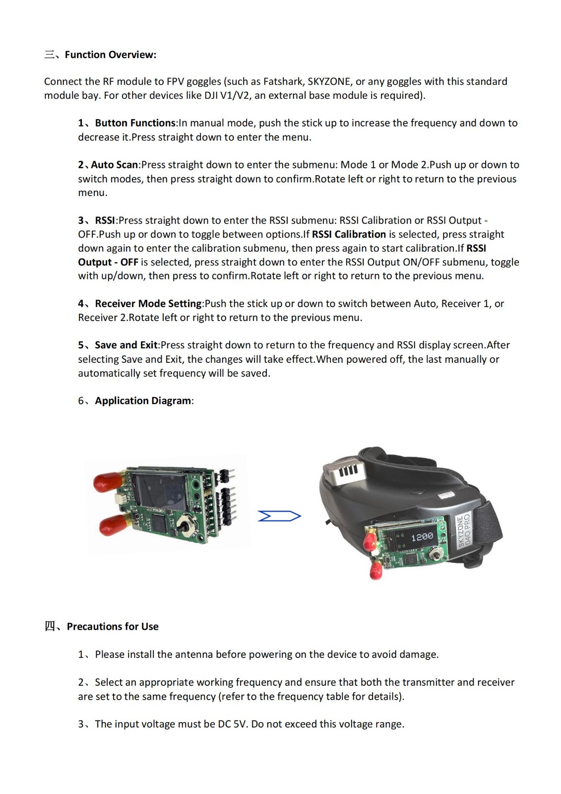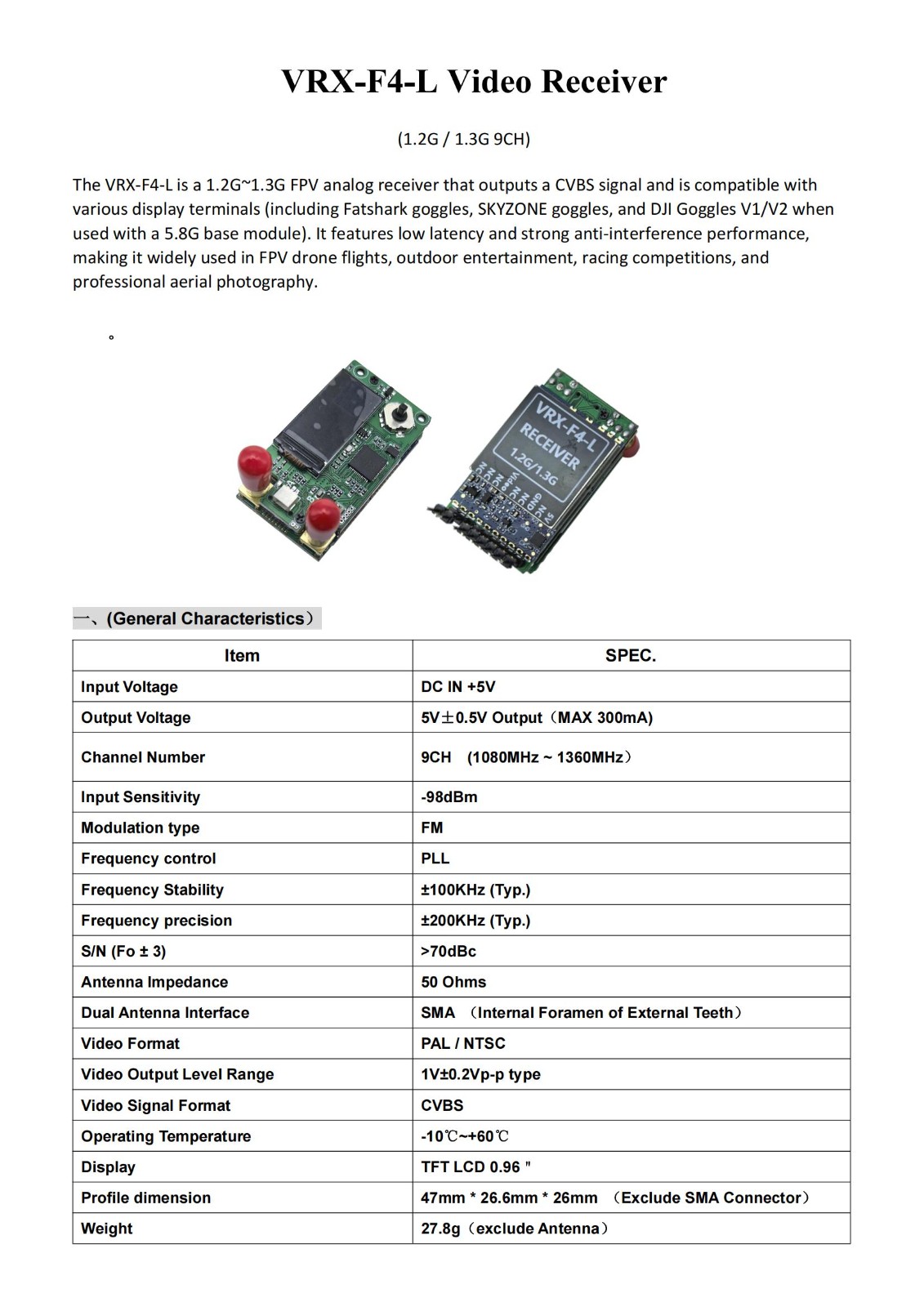 1.2/1.3Ghz 接收机 VRX 视频接收机 9CH 宽频(1080MHz至 1360MHz),兼容 Fatshark 护目镜SKYZONE 护目镜、DJI护目镜 V1 V2